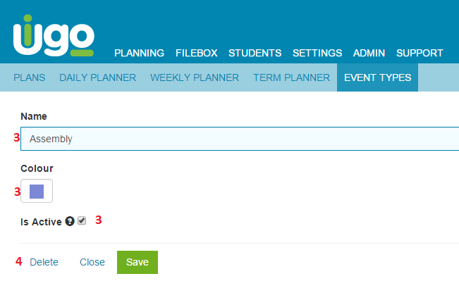 Click Planning>Event Types.Click on your event.To edit, change the details as needed and click Save.To delete, click Delete.