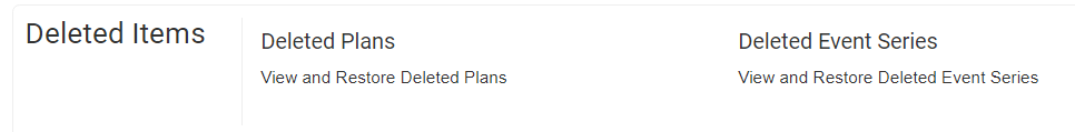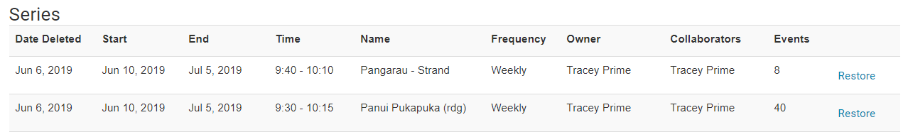 4. In the next page that loads you will see two parts 'Series' which will display deleted event series and 'Events' which will show deleted single events that were once offs.