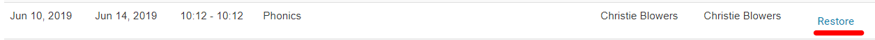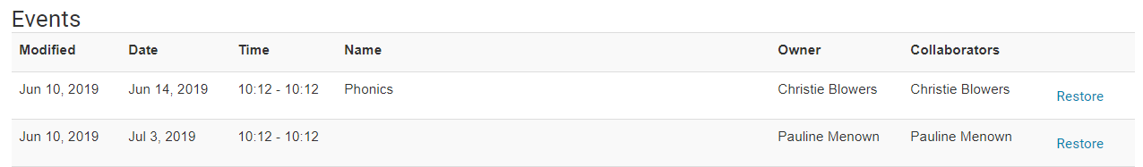 5. To locate the correct deleted item - ask the customer the name of the event, the timeframe and when it was deleted. Then click on the 'Restore' button and it will show up back on their accounts.