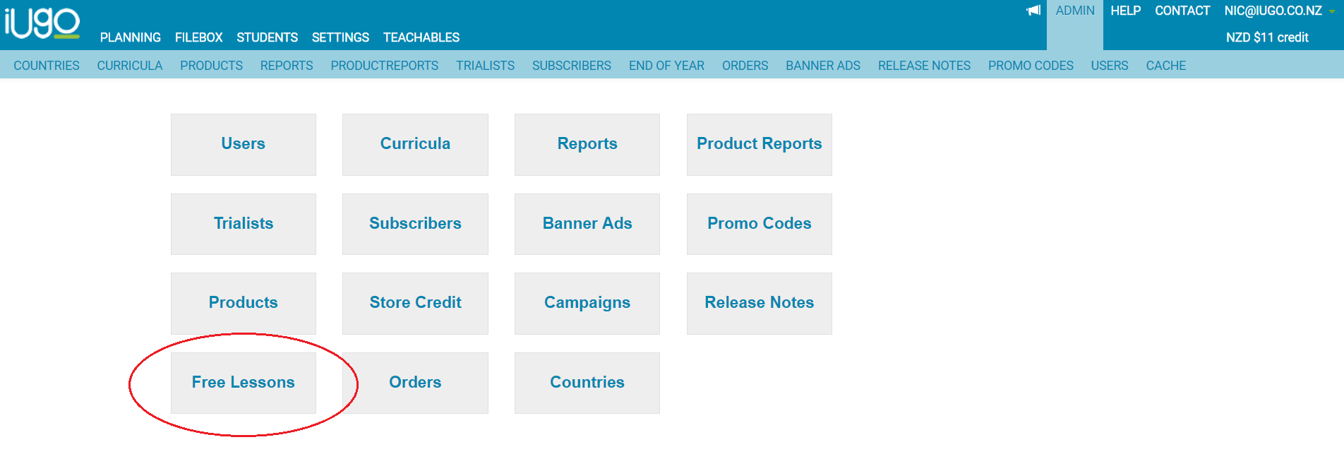 1. Sign into your admin account and go to Admin in the dark blue section to the right hand side then click on Free Lessons.
