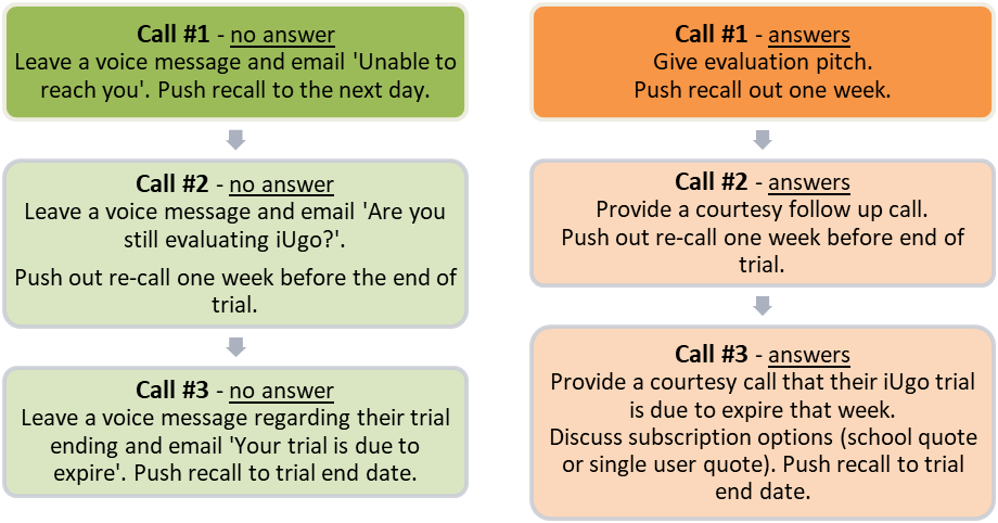 Below is the general process to follow and how to respond and set recalls according to if the teacher answers the phone or not.