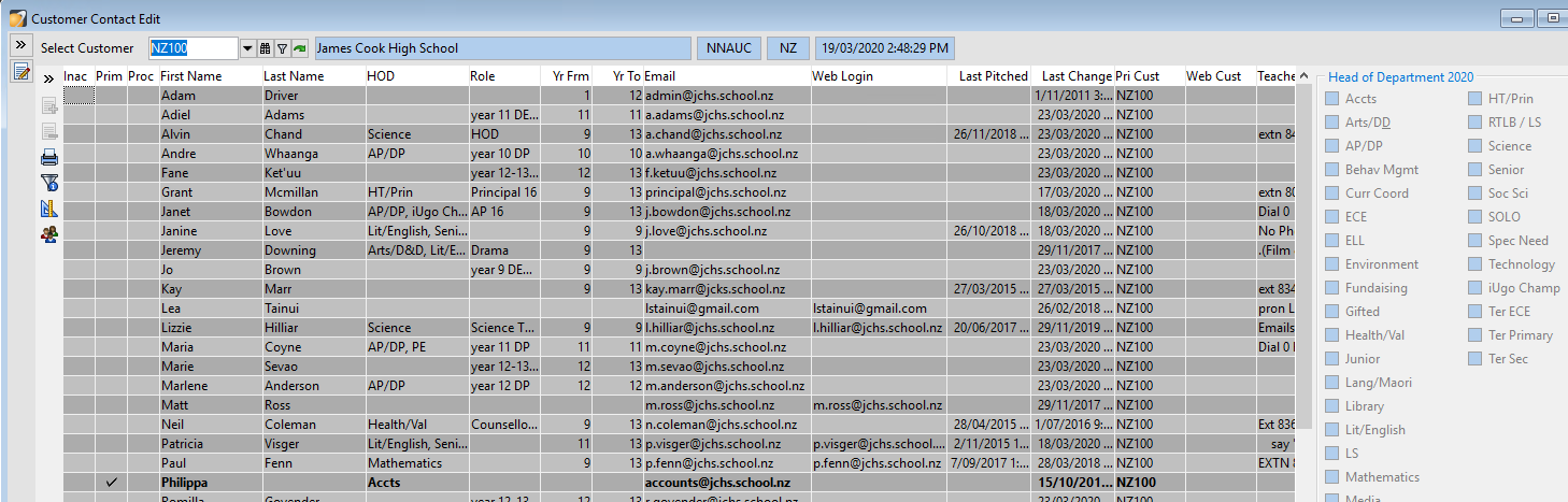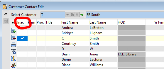 - To make a contact inactive (unable to do this for contacts with a web account) click on the first category 'Inac' a tick should appear.
