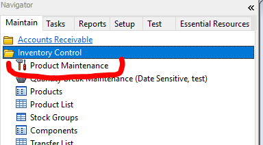 1. In Accredo go into the navigator to the left - then select Maintain, inventory control then open Product Maintenance.
