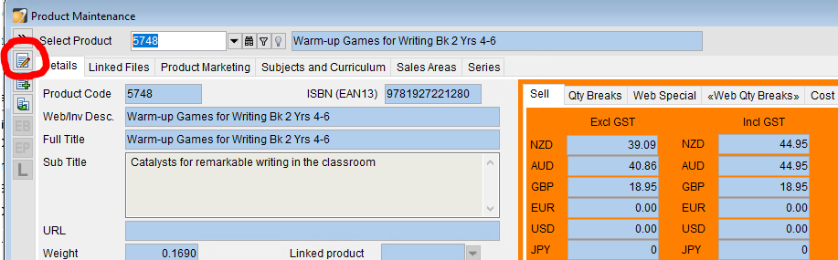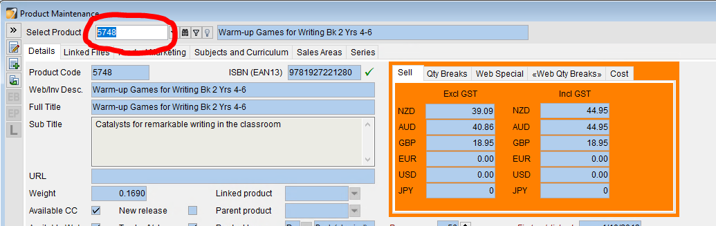 2. In the product maintenance pop-up, type the book code into 'select product' at the top left hand corner: