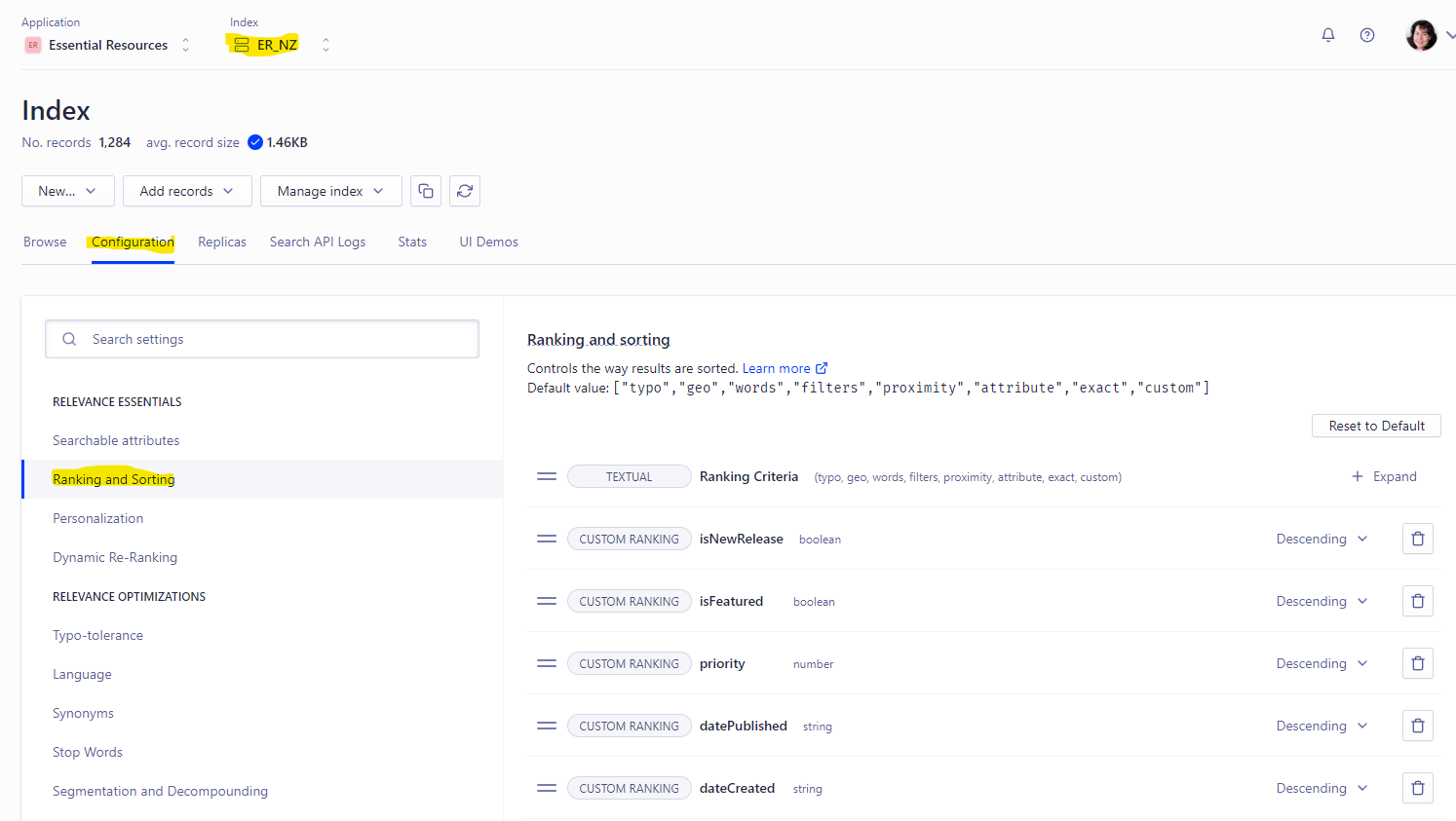 If you want to change this ordering, you can re-order things with Algolia to tweak the settings.
